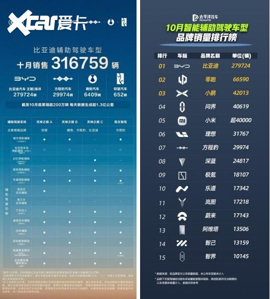 这种用户认可,也直接反映在了销量数据上。在太平洋汽车发布的10月智能驾驶车型品牌销量榜中,比亚迪以非常大的优势位居第一,其销量是第二名的四倍以上。今年8月时,比亚迪智驾车型在国内新车销量中的占比已达90%。这在某种程度上预示着,在比亚迪的新车用户中,绝大多数人都在主动选择并使用「天神之眼」系统。这种极高的渗透率,不仅带来了更大的数据规模,也形成了强大的用户习惯和品牌粘性。